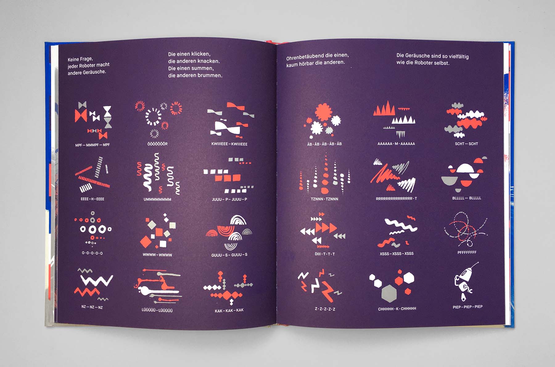 15. January 2026 Gerausche Two-page book spread with various abstract symbols and patterns in red, white, and black on a dark blue background, intended to represent different sounds, accompanied by short texts in German.